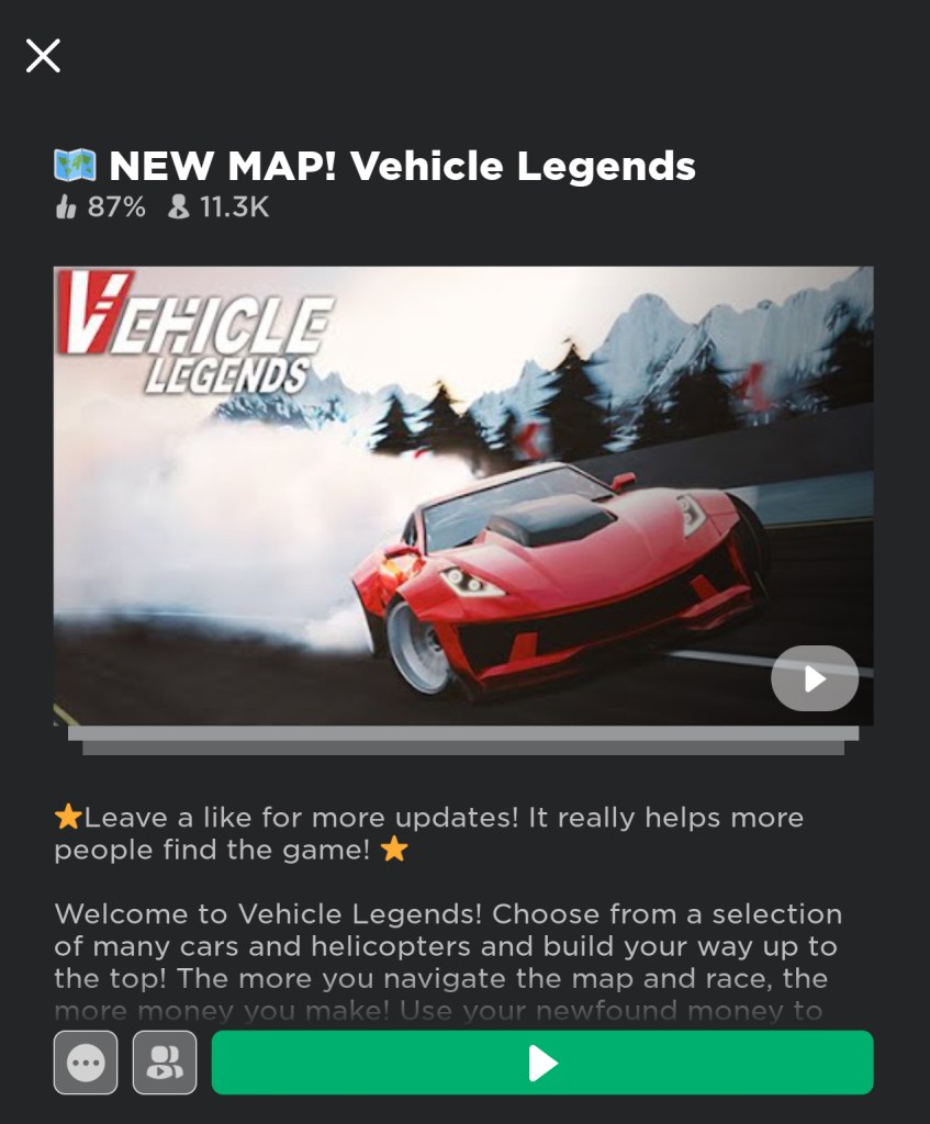 Vehicle Legends on Roblox is a cool game. In it your start of with 37,000 coins. You use those coins to buy a car. When you drive your car, you earn more coins. You can use those coins to buy another, cooler car. This game does glitch though because when I press my home to teleport to it, it does not teleport. My friend who has been playing longer than me says that sometimes teleporting works and sometimes it doesn’t. On the marianarchy scale: 3.5/5 stars.
